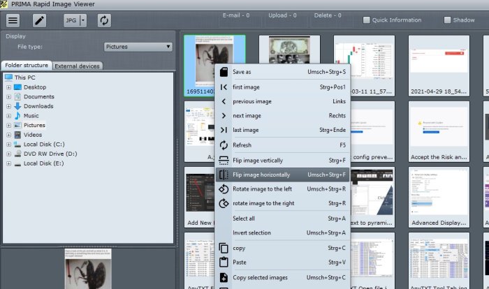 Từ những gì chúng tôi thu thập được, PRIMA Rapid Image View giúp người dùng có thể lật và xoay hình ảnh một cách dễ dàng. Để thực hiện việc này, hãy nhấp chuột phải vào một trong các hình thu nhỏ của hình ảnh, sau đó từ trình đơn, chọn Lật hình ảnh theo chiều dọc , Lật hình ảnh theo chiều ngang , Xoay hình ảnh để phải hoặc Xoay hình ảnh sang trái .