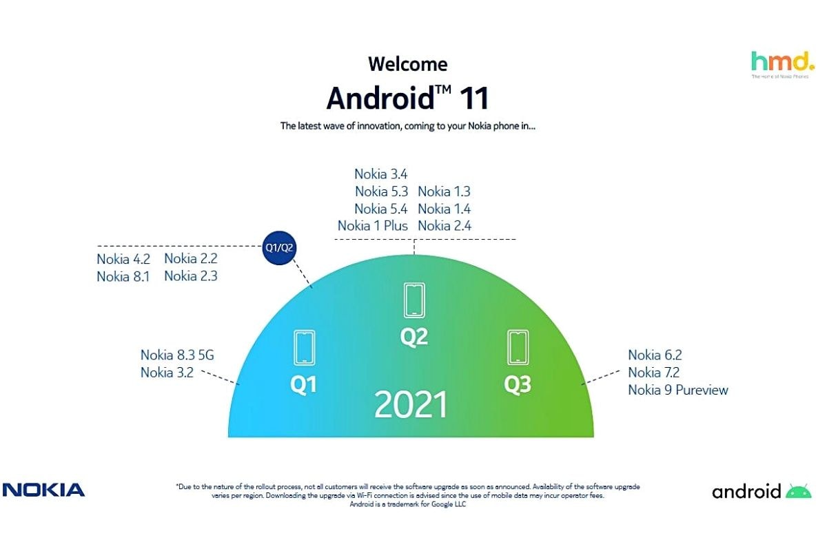 HMD Global đã phát hành lộ trình sửa đổi Android 11 cho điện thoại thông minh của mình. Lộ trình bao gồm tổng cộng 18 thiết bị sẽ nhận được bản cập nhật hệ điều hành Android 11 vào cuối quý 3 (ngày 30 tháng 9) năm nay. Trong quý đầu tiên của năm 2021, tám điện thoại thông minh-Nokia 3.2, Nokia 8.3, Nokia 4.2, Nokia 8.1, Nokia 2.2 và Nokia 3.2 đã nhận được bản cập nhật phần mềm. Các điện thoại thông minh như Nokia 1 Plus, Nokia 1.3, Nokia 5.3, Nokia 5.4, Nokia 3.4, Nokia 6.2 và Nokia V8 5G UW sẽ nhận được bản cập nhật trong quý này. Mặt khác, Nokia Nokia 1.4 và Nokia 2.3 đã nhận được Android 11 trong quý 2, tức là vào tháng 4. Công ty cho biết thêm rằng Nokia 6.2 và Nokia 7.2 sẽ nhận được bản cập nhật phần mềm vào Quý 3, nhưng ngày phát hành chính xác vẫn chưa rõ ràng. Nokia 9 PureView được cho là sẽ nhận được bản cập nhật trong quý này theo lộ trình cũ, nhưng thông tin sửa đổi cho thấy nó sẽ nhận được Android 11 vào quý 3.