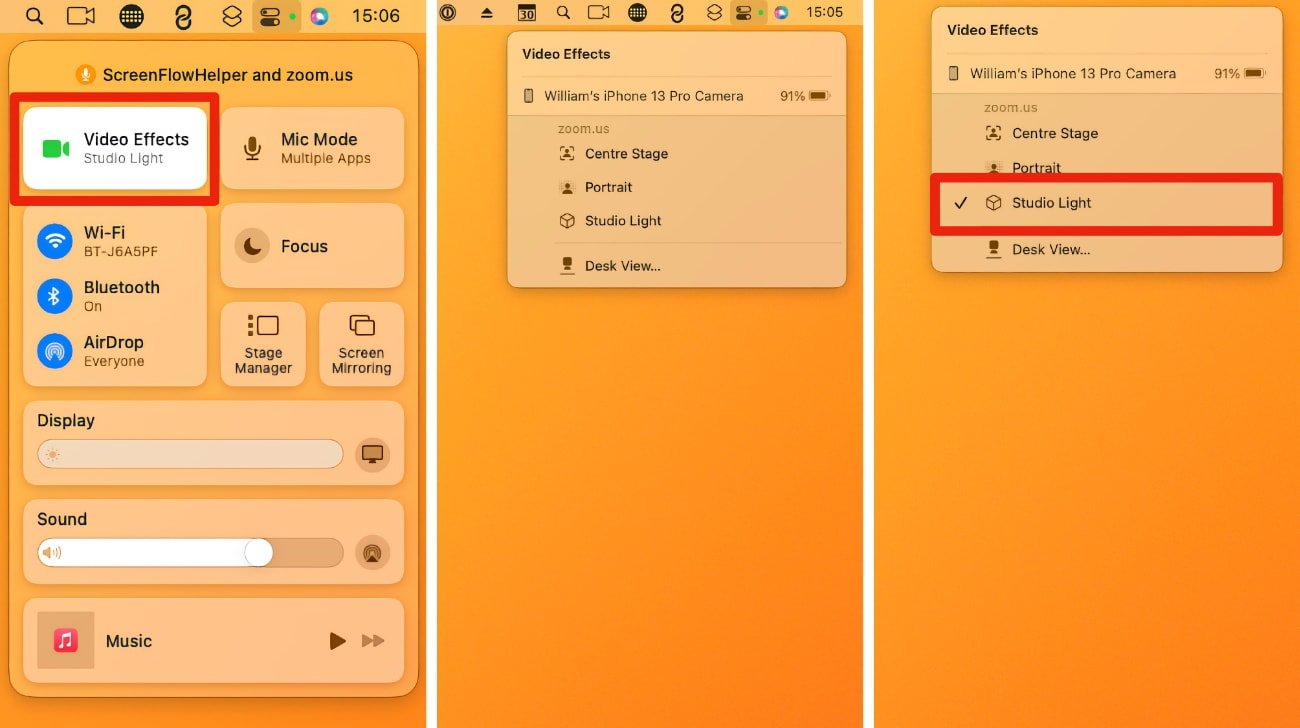 Trung tâm điều khiển có thể được tìm thấy trong thanh trình đơn của Mac, bên dưới một biểu tượng trông giống như hai nút bật tắt. Ở trên cùng, hai tùy chọn xuất hiện để điều khiển máy ảnh và micrô. Nhấp vào Hiệu ứng video sẽ hiển thị Sân khấu trung tâm, Chân dung, Ánh sáng studio và Chế độ xem bàn. Micrô cũng có thể sử dụng cài đặt cách ly âm thanh. Studio Light có thể làm sáng khuôn mặt của người dùng và làm tối nền một chút. Đó là một lựa chọn tuyệt vời cho những người trong điều kiện ánh sáng yếu.