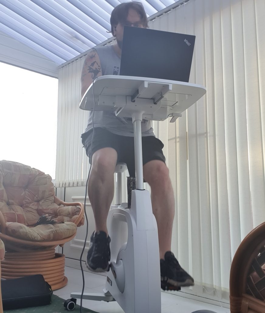 Phần còn lại của máy rất chắc chắn. Các bánh xe mở ra và tạo ra một cơ sở rất ổn định, và nó hoàn toàn không di chuyển, ngay cả khi tôi thực sự đi bằng bàn đạp. Thật kỳ lạ, nó cũng không di chuyển tốt khi bạn không ngồi trên đó; bánh xe hơi cứng. Các bộ phận có thể di chuyển được ít nhất cũng có chức năng. Có một cần gạt trên ghế để bạn điều chỉnh chiều cao theo yêu cầu, cũng như hai cần gạt trên bàn-một cho phép bạn nâng hoặc hạ chiều cao của nó, cái kia cho phép bạn di chuyển bàn theo chiều ngang, điều chỉnh để tạo sự thoải mái và dễ sử dụng.