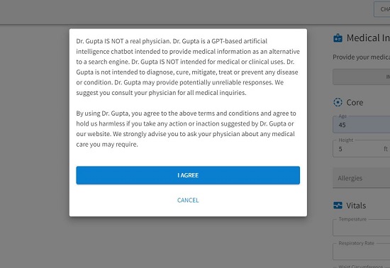 1. Điều hướng đến Tiến sĩ Gupta bằng liên kết mà chúng tôi đã cung cấp ở cuối bài viết này và đăng ký tài khoản miễn phí bằng thông tin đăng nhập Google của bạn. Khi bạn được nhắc chấp nhận Điều khoản và Điều kiện, hãy đọc chúng thật cẩn thận và chỉ sau đó nhấp vào’Tôi đồng ý’. Hãy lưu ý đến tuyên bố từ chối trách nhiệm nêu rõ rằng bất kỳ ai sử dụng chatbot đều tự chịu rủi ro và công ty không chịu trách nhiệm pháp lý đối với bất kỳ “lỗi, nhầm lẫn hoặc không chính xác” hoặc bất kỳ thương tích cá nhân nào có thể xảy ra do sử dụng chatbot.