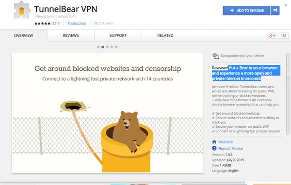 TunnelBear dành cho Chrome là một tiện ích mở rộng trình duyệt đơn giản có thể giúp bạn. Bạn có thể kết nối với mạng riêng cực nhanh với kết nối tới 20 quốc gia.