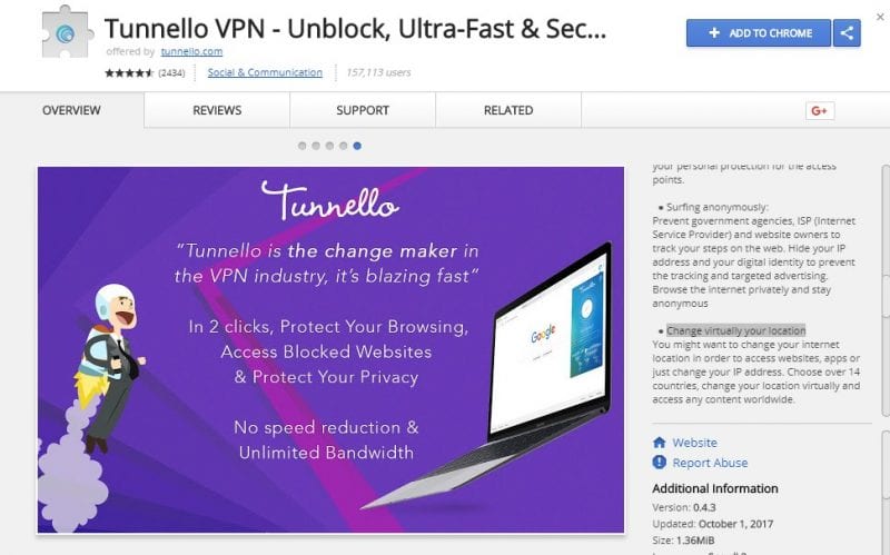 Tunnello là một tiện ích mở rộng chrome cực nhanh và hoàn toàn an toàn. Bạn có thể sử dụng VPN này để bảo mật kết nối của mình và truy cập vào bất kỳ thứ gì bị chặn ở quốc gia, trường học hoặc công ty của bạn.