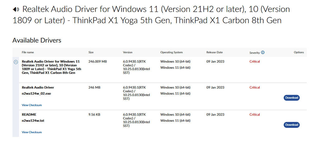 Truy cập trang tải xuống trình điều khiển Realtek Audio trên trang web chính thức của Lenovo. Tìm tệp Windows 11 trình điều khiển âm thanh Realtek gần đây nhất và chọn nút Tải xuống.
