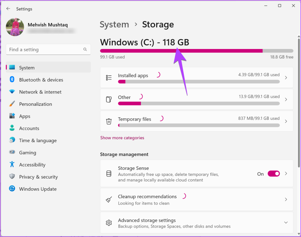 Bước 3: Bạn sẽ thấy dung lượng lưu trữ bị chiếm bởi ổ đĩa C của Windows. Nếu bạn không có bất kỳ phân vùng đĩa nào khác, thì đây là tổng dung lượng của PC Windows của bạn. Tuy nhiên, nếu bạn có nhiều phân vùng hơn, hãy chuyển sang bước tiếp theo.