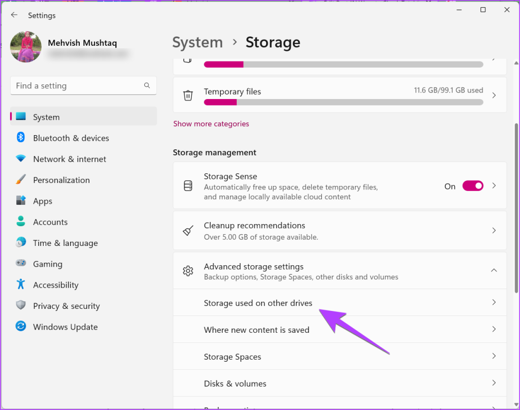 Bước 4: Nhấp vào Cài đặt bộ nhớ nâng cao ở dưới cùng và chọn’Bộ nhớ được sử dụng trên các ổ đĩa khác.’