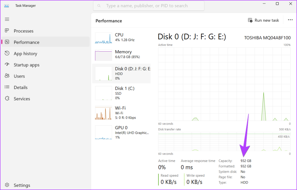 Xin lưu ý rằng nếu bạn thấy nhiều ổ đĩa, hãy lưu ý cùng một số cho các ổ đĩa khác và thêm chúng để tính toán dung lượng lưu trữ của PC Windows của bạn.