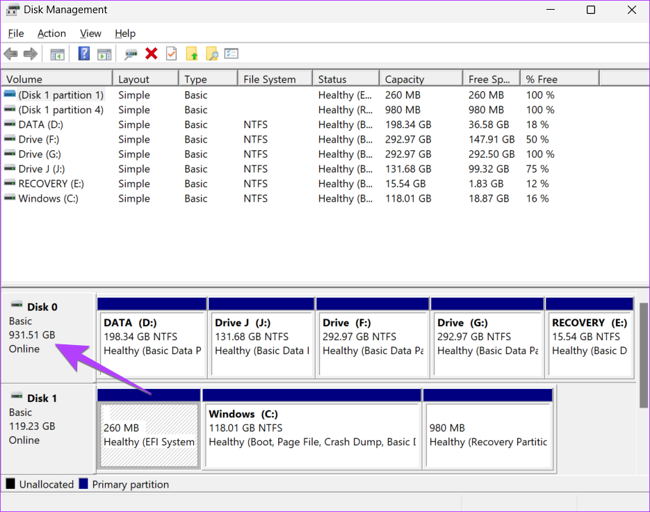 Bước 5: Tại đây, bạn sẽ thấy tất cả các phân vùng đĩa của ổ cứng hoặc SSD. Lưu ý các số bên cạnh tên ổ đĩa. Mở ứng dụng Máy tính và thêm chúng để biết tổng kích thước ổ cứng của máy tính xách tay hoặc máy tính để bàn chạy Windows của bạn.