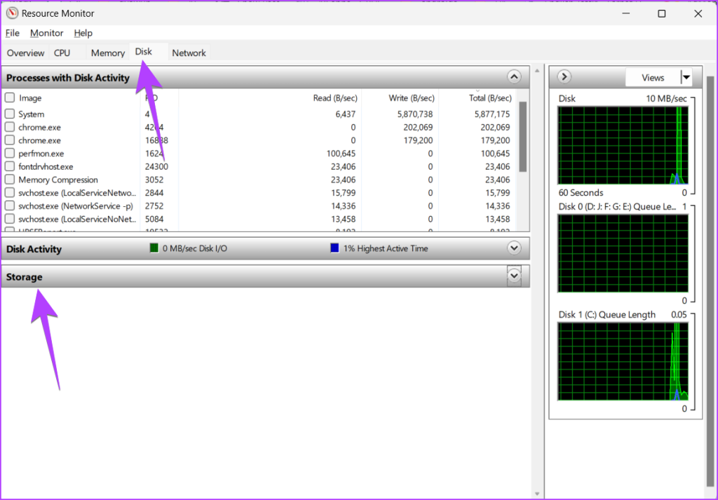 Bước 3: Nhấp vào tab Đĩa ở trên cùng và mở rộng phần Bộ nhớ.