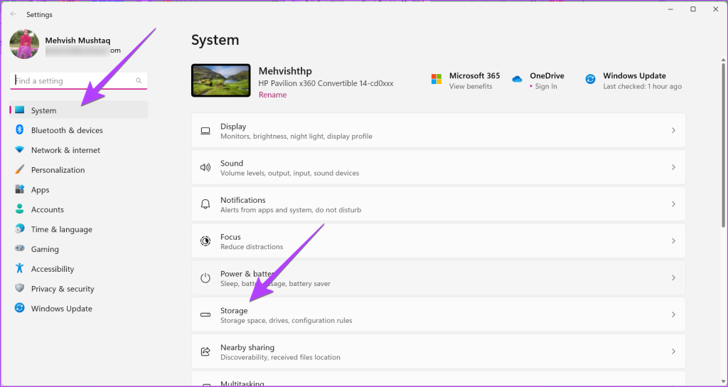 Bước 2: Chuyển đến Hệ thống trong thanh bên và nhấp vào Bộ nhớ từ bên phải.