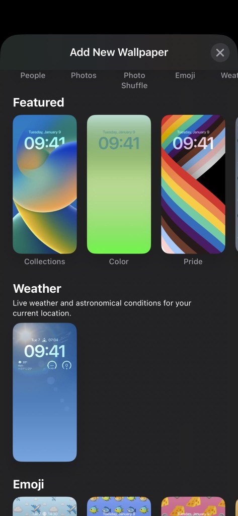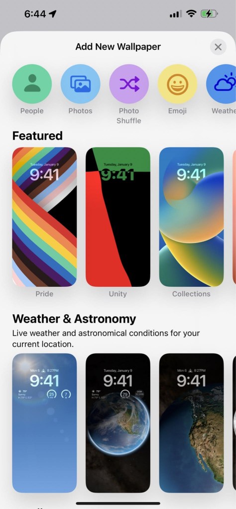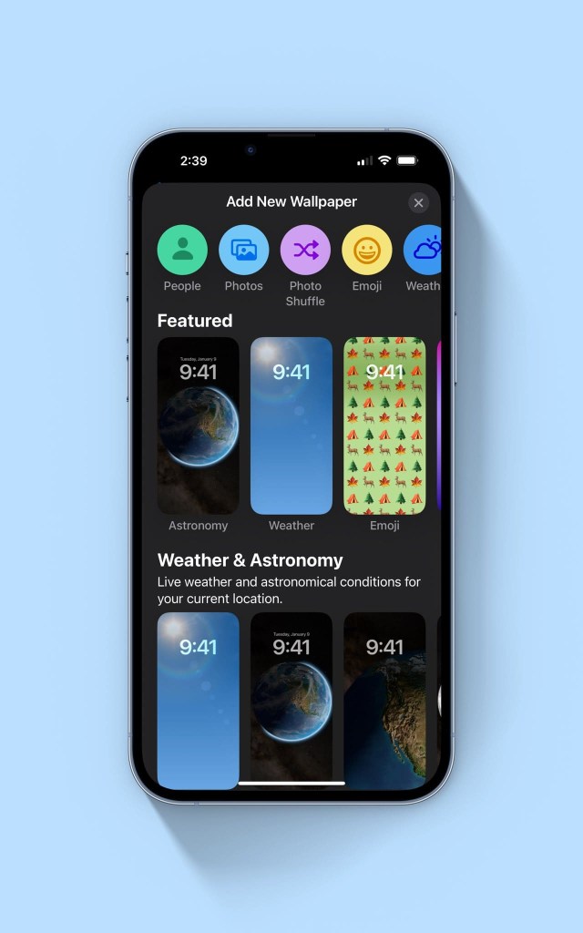 Hơn nữa, iOS 17 giới thiệu một thư viện Màn hình khóa mở rộng với một loạt các tùy chọn hình nền dưới ô Bộ sưu tập của Apple. Các bộ sưu tập này bao gồm Pride and Unity, được thiết kế để kỷ niệm những khoảnh khắc văn hóa đặc biệt, hình nền Thời tiết hiển thị các điều kiện thời tiết theo thời gian thực trong ngày và hình nền Thiên văn học cung cấp tầm nhìn ngoạn mục về Trái đất, mặt trăng và hệ mặt trời.