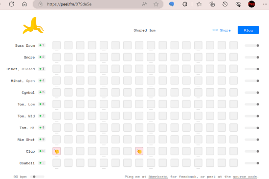 Peel là một máy đánh trống trực tuyến/mã nguồn mở miễn phí với phong cách Roland 808 mà bạn có thể sử dụng. Nó hoạt động ngay bên trong trình duyệt của bạn và nếu bạn có kiến thức về trống thì bạn có thể sử dụng nó với sự trợ giúp của bàn di chuột hoặc chuột. Ở đây Nó cung cấp cho bạn một giao diện trực quan giống như lưới, nơi bạn có thể soạn nhịp của mình. Nó cho phép bạn chia sẻ con nhóc của mình với những người khác thông qua liên kết.