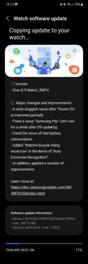 Bản cập nhật One UI Watch 5 thứ hai dành cho Galaxy Watch 4 và Galaxy Watch 5 đi kèm với phiên bản chương trình cơ sở R870XXU1ZWF4 (thông qua Yash Rathore). Đây là bản cập nhật có dung lượng 188,72 MB và mang theo bản vá bảo mật tháng 6 năm 2023 cho đồng hồ thông minh. Theo nhật ký thay đổi, Samsung đã cải thiện hiệu suất và sửa rất nhiều lỗi.