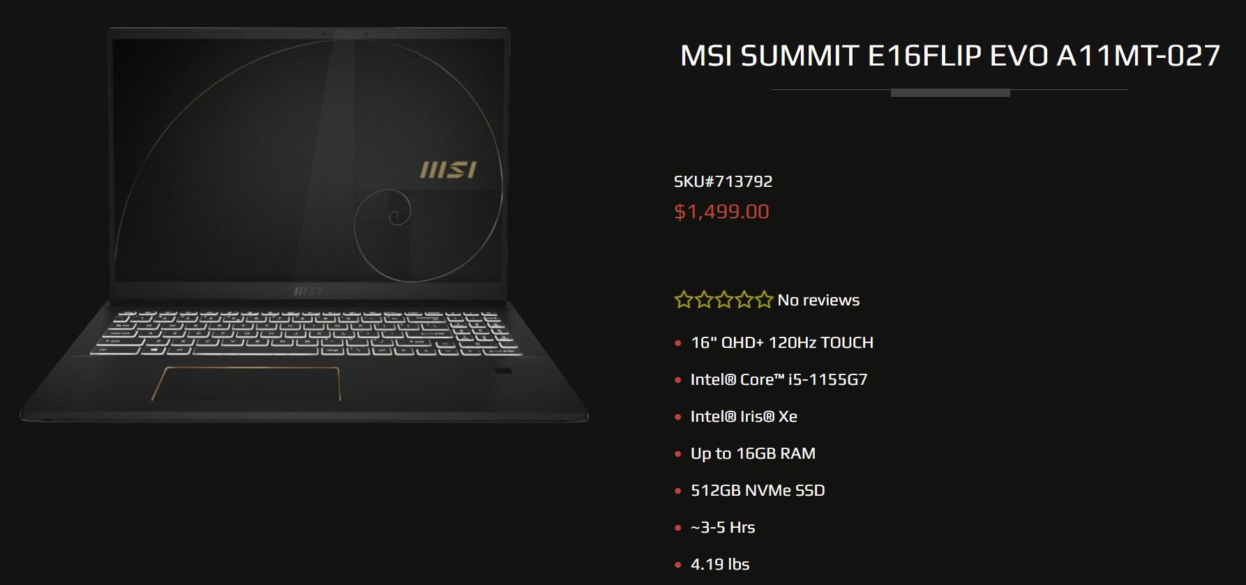 Mẫu Core i7-1195G7 Summit E16 Flip là được niêm yết ở mức 1.699 USD, trong khi i5-1155G7 bán lẻ ở mức 1.499 USD. Nhưng các mô hình đã có thể được tùy chỉnh và đặt hàng trước.