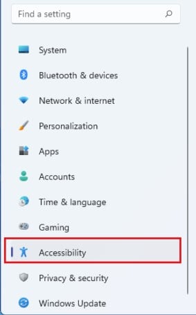 Bước 2. Trên ứng dụng Cài đặt, nhấp vào tùy chọn ‘ Trợ năng ‘. Tùy chọn nằm ở bên trái màn hình.