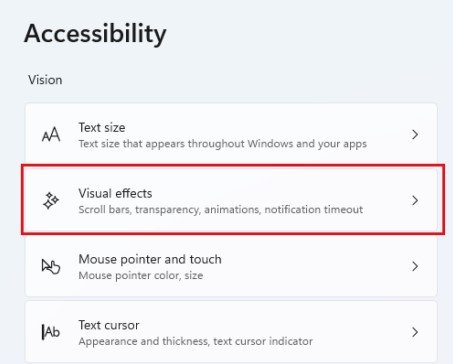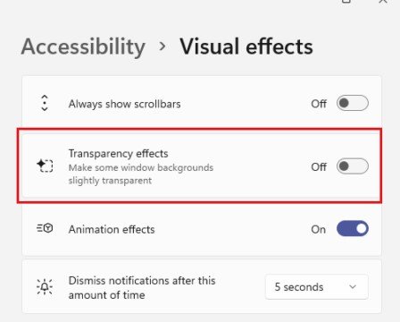 Windows 11 cũng bao gồm các hiệu ứng hình ảnh giúp thanh tác vụ, menu và các khu vực hoạt động khác trong suốt và mờ. Mặc dù các tính năng trực quan đã được giới thiệu để cải thiện trải nghiệm Windows, nhưng nhiều người dùng thấy nó không cần thiết.