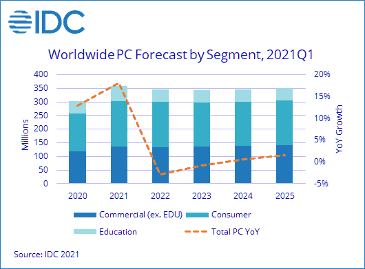 Tập đoàn Dữ liệu Quốc tế (IDC) có đã xuất bản dự báo về thị trường máy tính cá nhân toàn cầu cho những năm hiện tại và tương lai. Bất chấp sự thiếu hụt linh kiện điện tử trên toàn cầu, ngành công nghiệp này sẽ cho thấy sự tăng trưởng đáng kể vào năm 2021.
