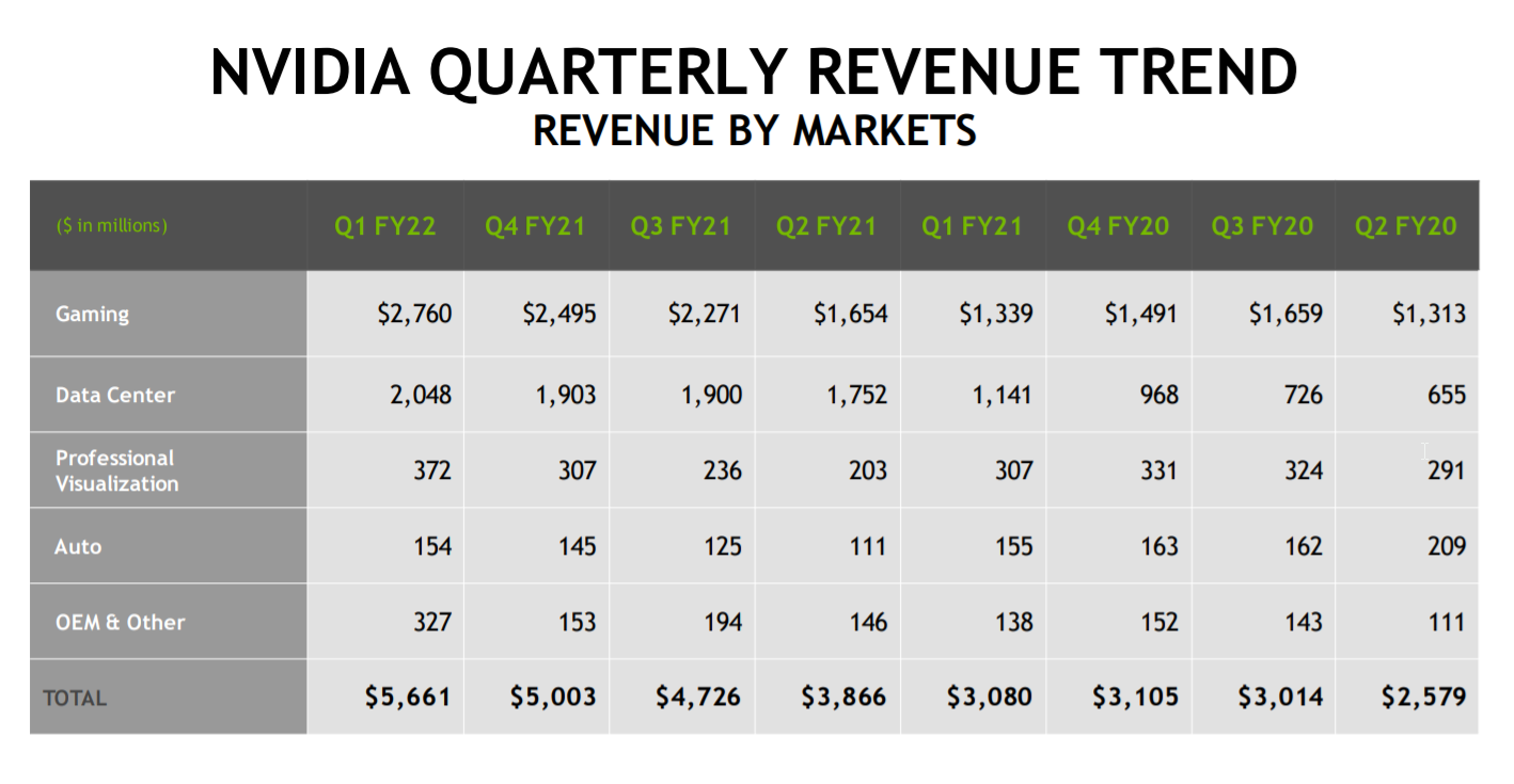SANTA CLARA, California, ngày 26 tháng 5 năm 2021-NVIDIA (NASDAQ: NVDA) hôm nay báo cáo doanh thu kỷ lục trong quý đầu tiên kết thúc Ngày 2 tháng 5 năm 2021, là 5,66 tỷ đô la, tăng 84% so với một năm trước đó và tăng 13% so với quý trước, với doanh thu kỷ lục từ các nền tảng Trò chơi, Trung tâm dữ liệu và Hình ảnh hóa chuyên nghiệp của công ty.