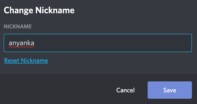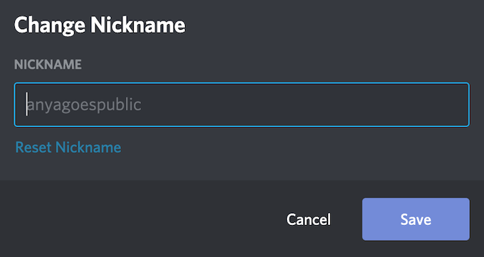 Bạn có thể thay đổi Biệt hiệu của mình trên một máy chủ. Tùy chọn này cho phép bạn duy trì các cấu hình riêng biệt trên các máy chủ khác nhau. Bằng cách đó, bạn có thể có biệt hiệu vui nhộn trên máy chủ với bạn bè thân thiết của mình, biệt hiệu nghiêm túc hơn trên máy chủ có các cuộc thảo luận liên quan đến công việc và tên dễ nhận biết trên máy chủ chơi game.